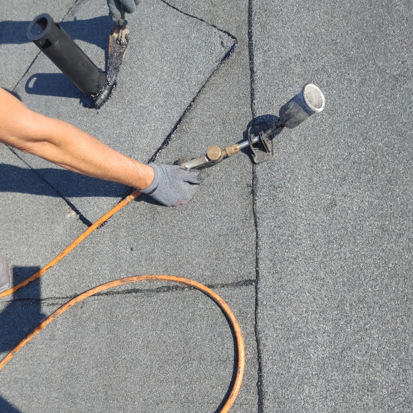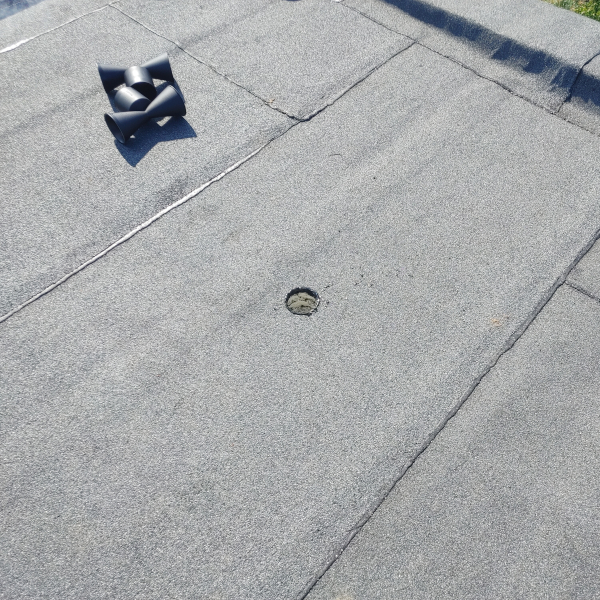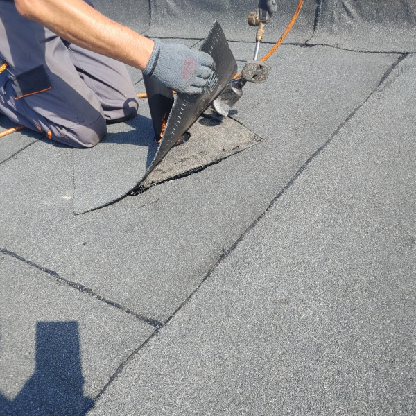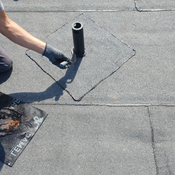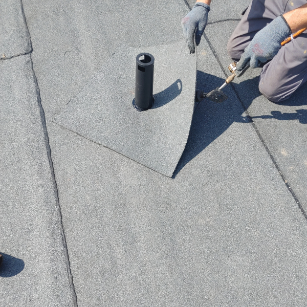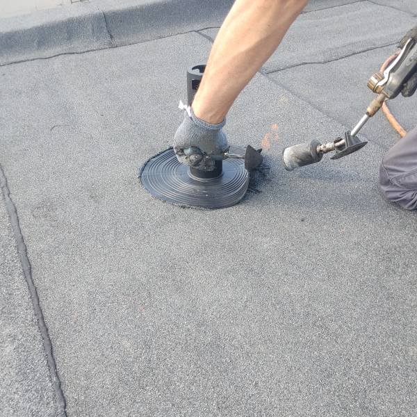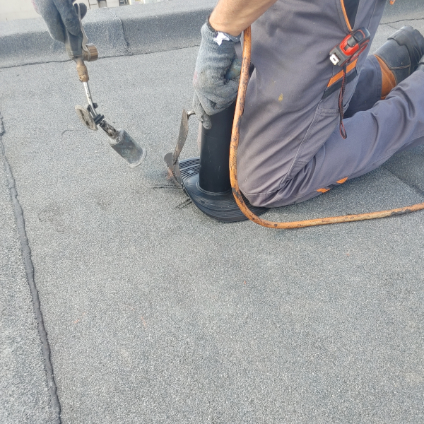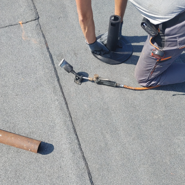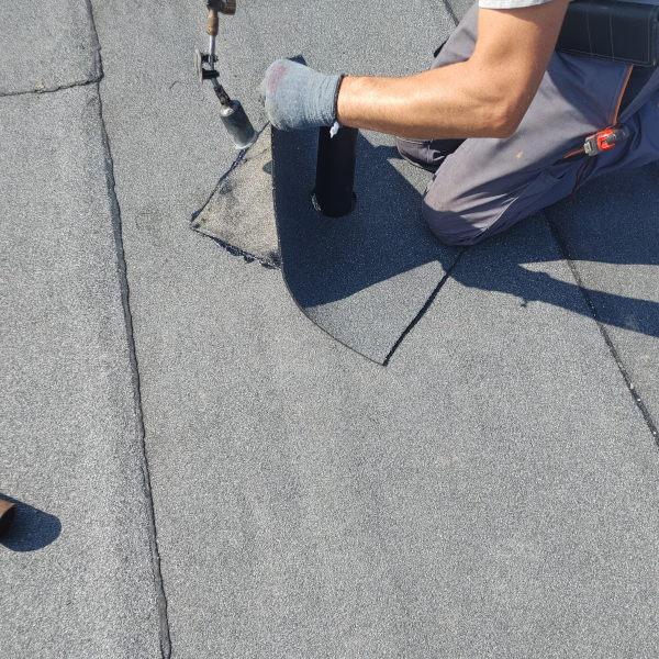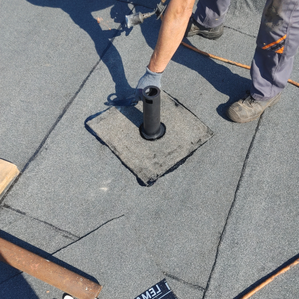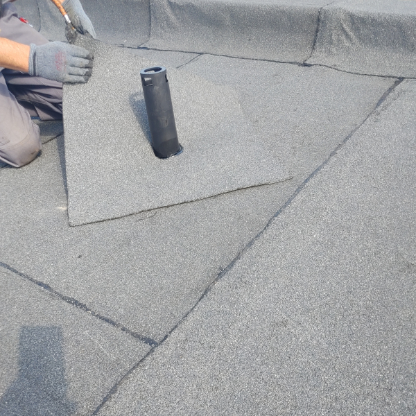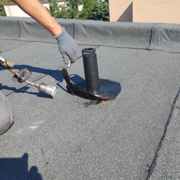 - Zgrzać kawałek papy z kominkiem dla większego uszczelnienia.